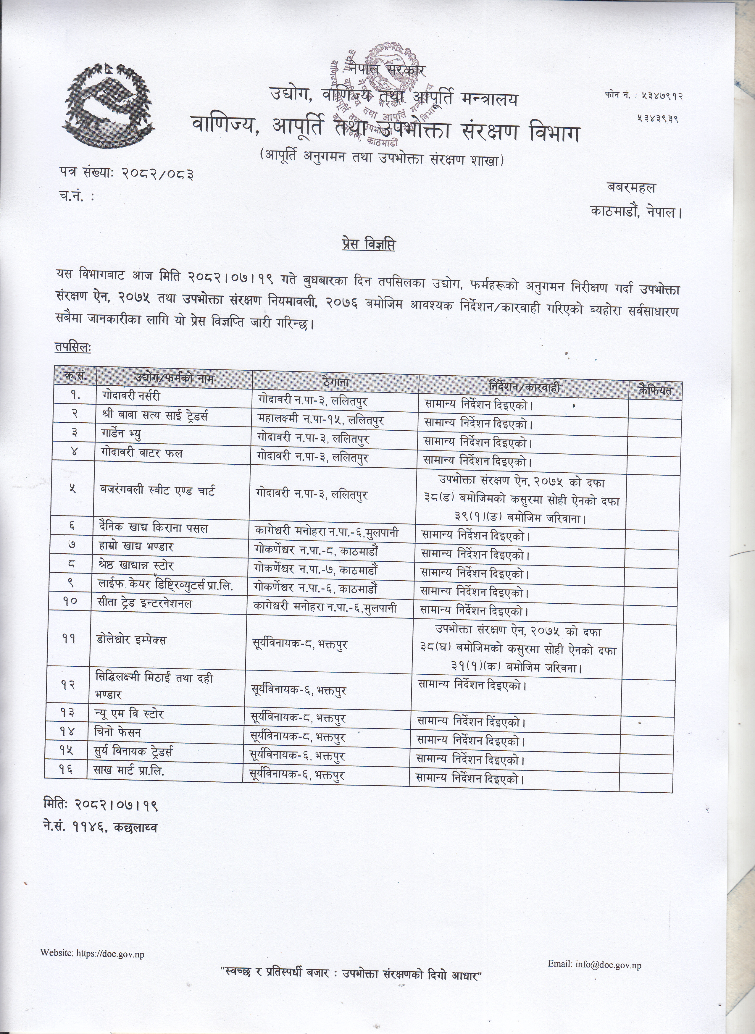 मिति २०८२।०७।१९ गते मंगलबार को बजार अनुगमन प्रतिवेदन