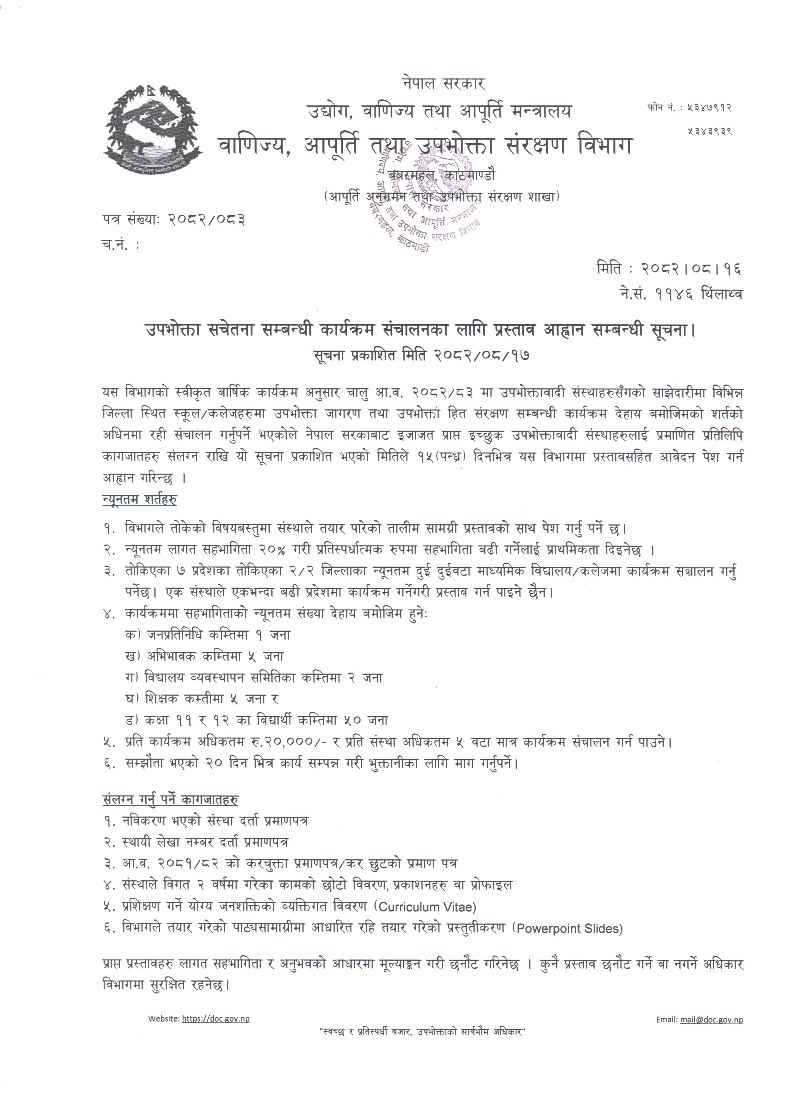 उपभोक्ता सचेतना सम्बन्धी कार्यक्रम संचालनका लागि प्रस्ताव आह्वान सम्बन्धी सूचना
