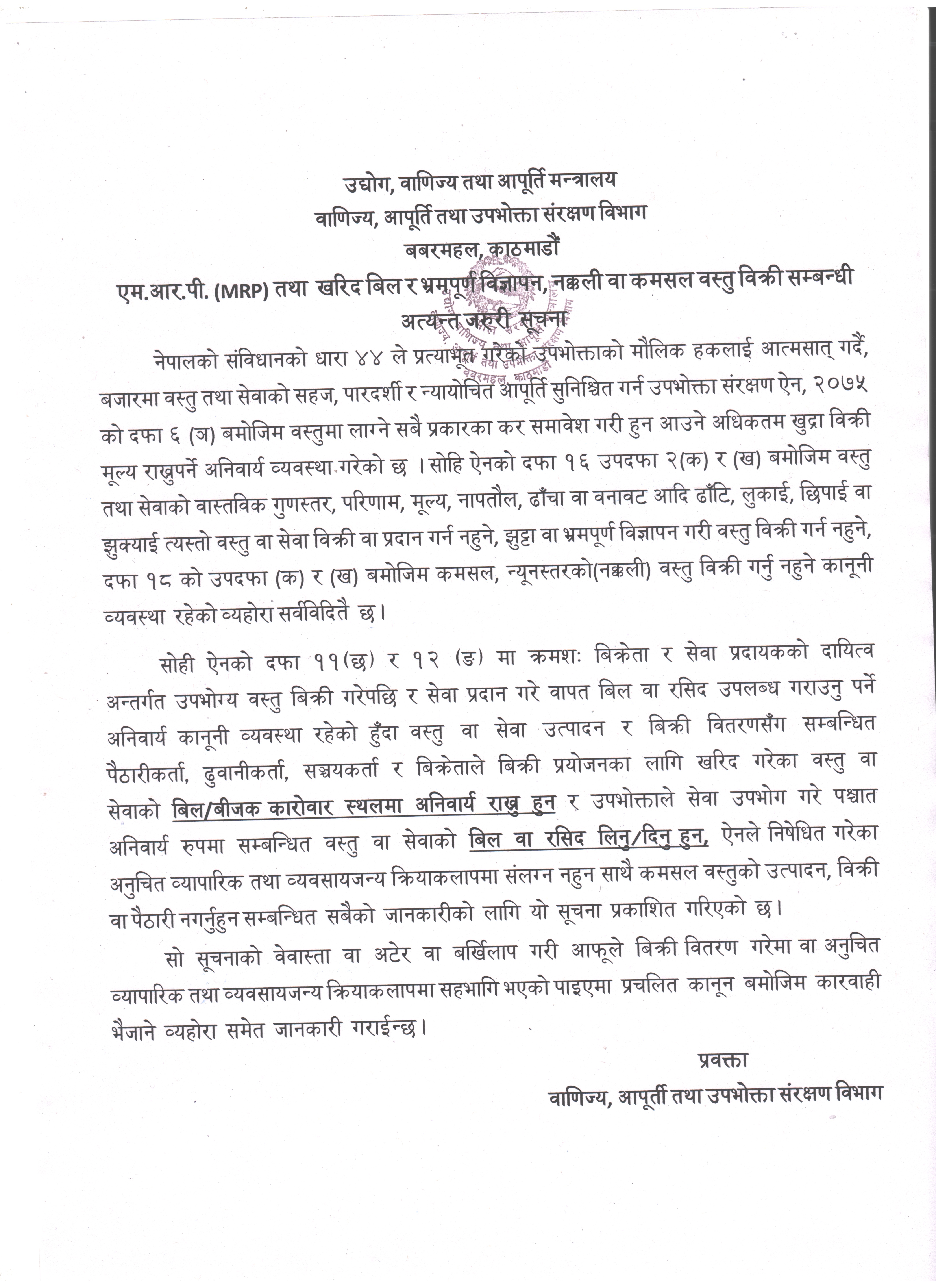 एम.आर.पी. (MRP) तथा खरिद बिल र भ्रमपूर्ण विज्ञापन, नक्कली वा कमसल वस्तु विक्री सम्बन्धी अत्यन्त जरुरी सूचना