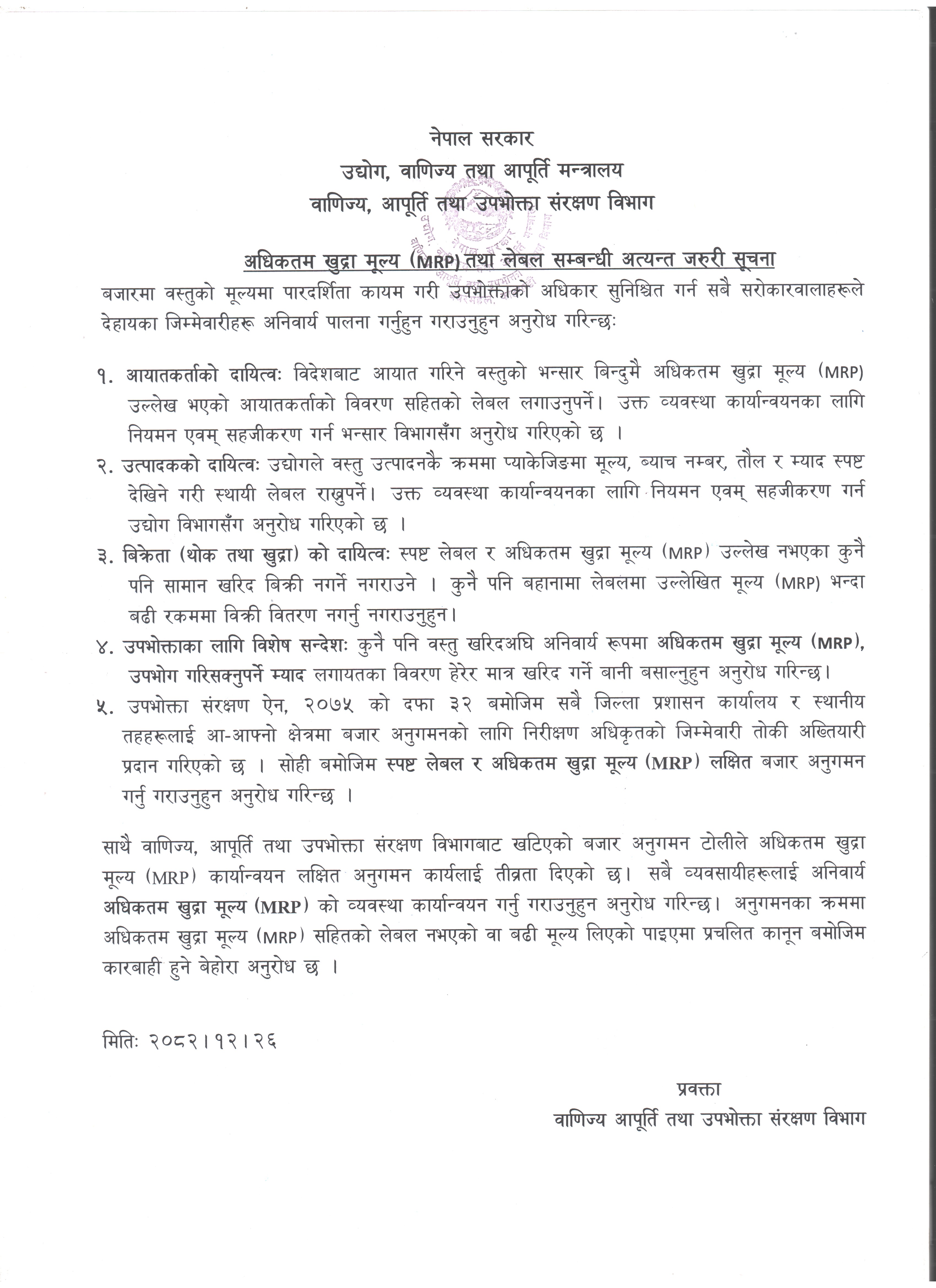 एम.आर.पी. (MRP) तथा खरिद बिल र भ्रमपूर्ण विज्ञापन, नक्कली वा कमसल वस्तु विक्री सम्बन्धी अत्यन्त जरुरी सूचना